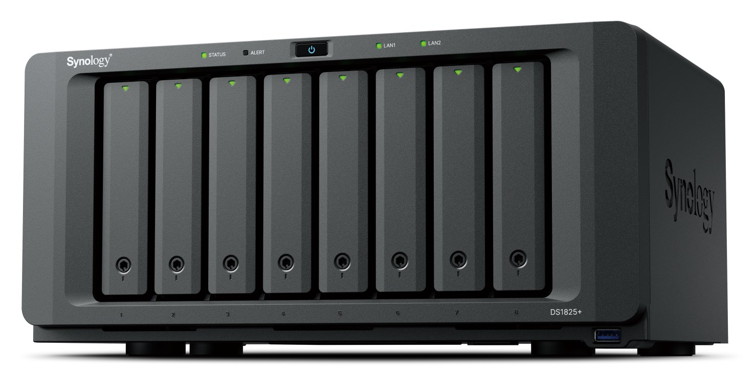 NAS Synology DS1825+, Tower, 8x 2.5"/3.5" SATA + 2x M.2 2280 NVMe SSD, AMD Ryzen V1500B, 8GB DDR4 (max.32GB), 2x 2.5GbE RJ-45, 3x USB 3.2, adapter 250