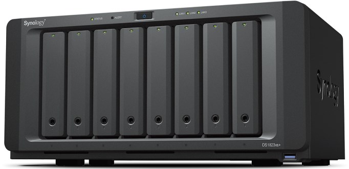 NAS Synology DS1823xs+; Tower; 8x (3.5" SATA HDD/2.5" SATA SSD); AMD Ryzen V1780B, 8 GB DDR4 ECC SODIMM (max. 32GB), 2x 1GbE RJ-45, 1x 10GbE RJ-45